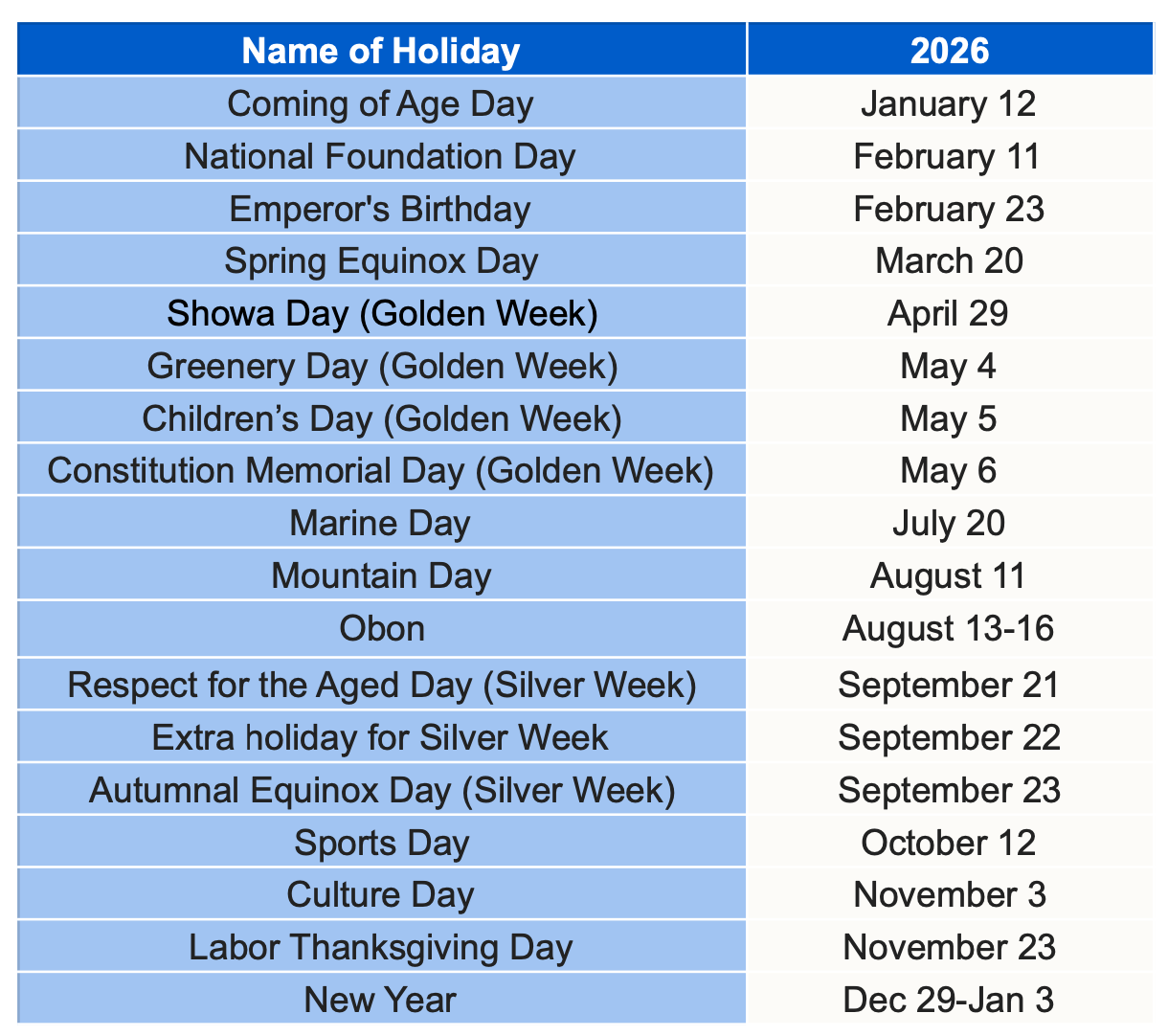 La siguiente tabla muestra los días festivos japoneses para el año 2026.