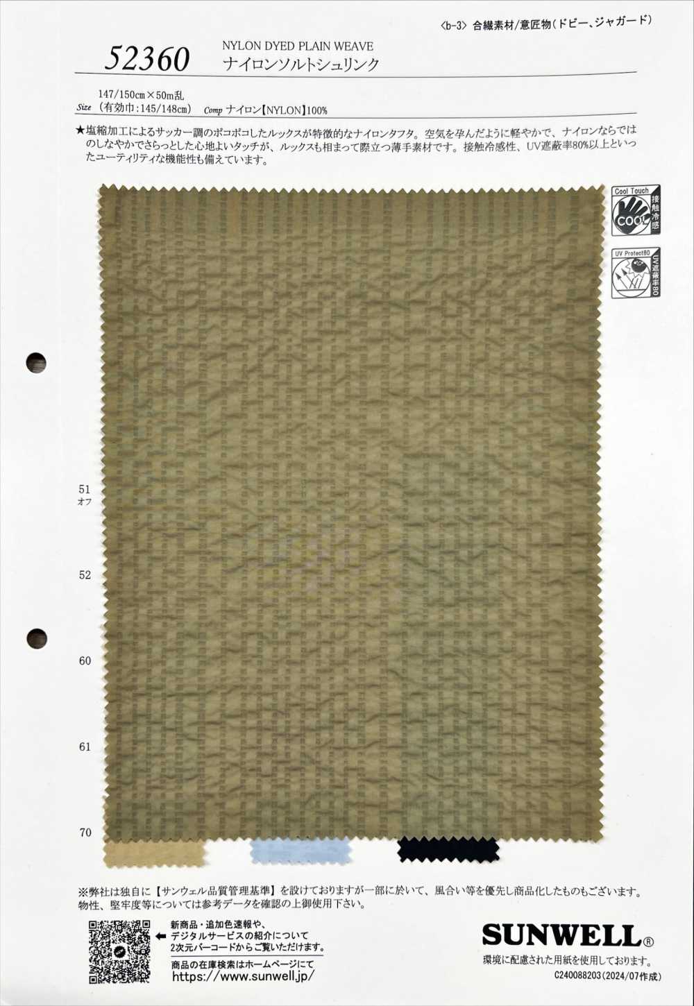 La textura arrugada creada por el procesamiento especial y la sensación de tacto seco lo hacen cómodo contra la piel y, combinado con su funcionalidad de absorber la humedad y secarse rápidamente, es un material que esperamos se utilice para crear una variedad de artículos que te ayuden a superar el caluroso verano.