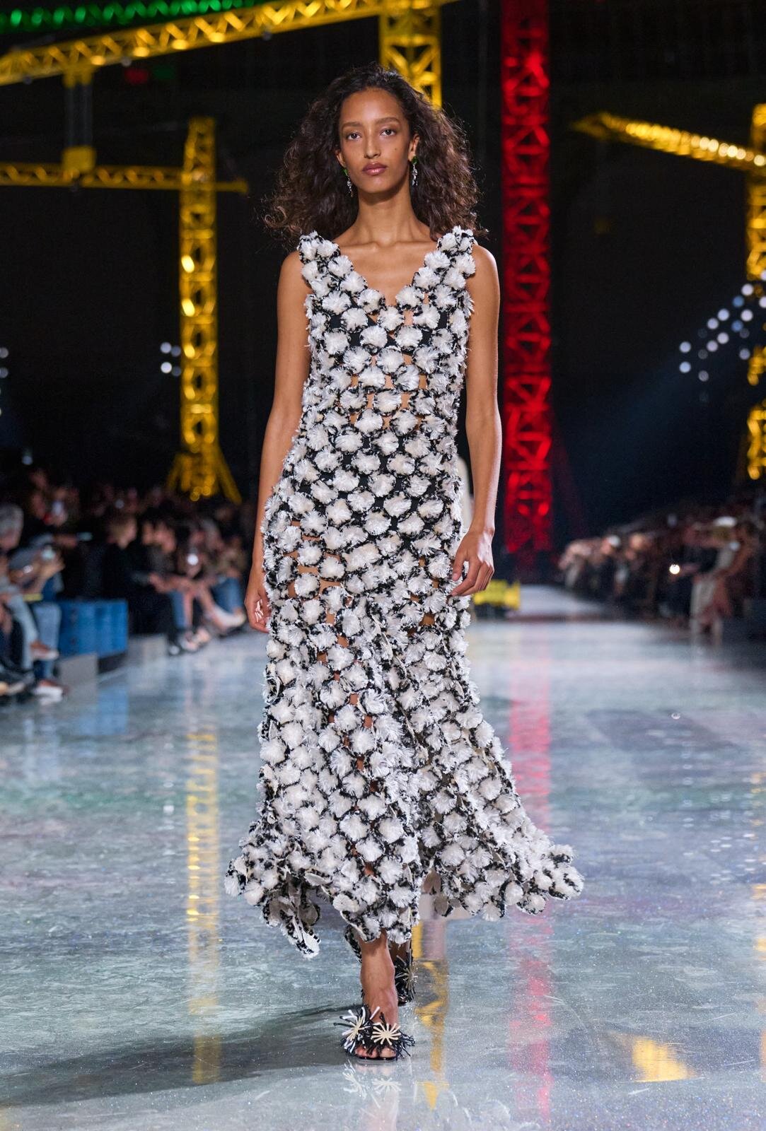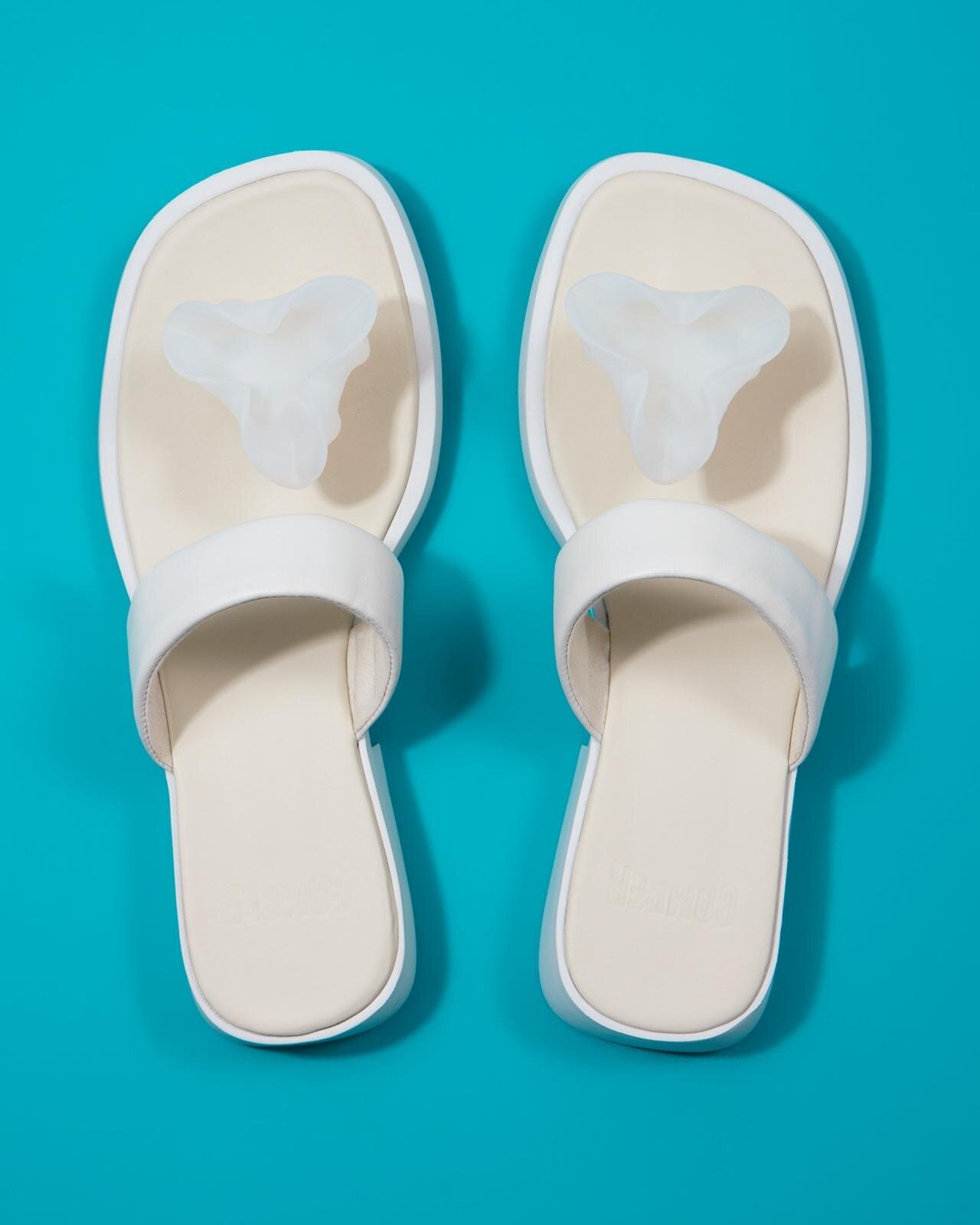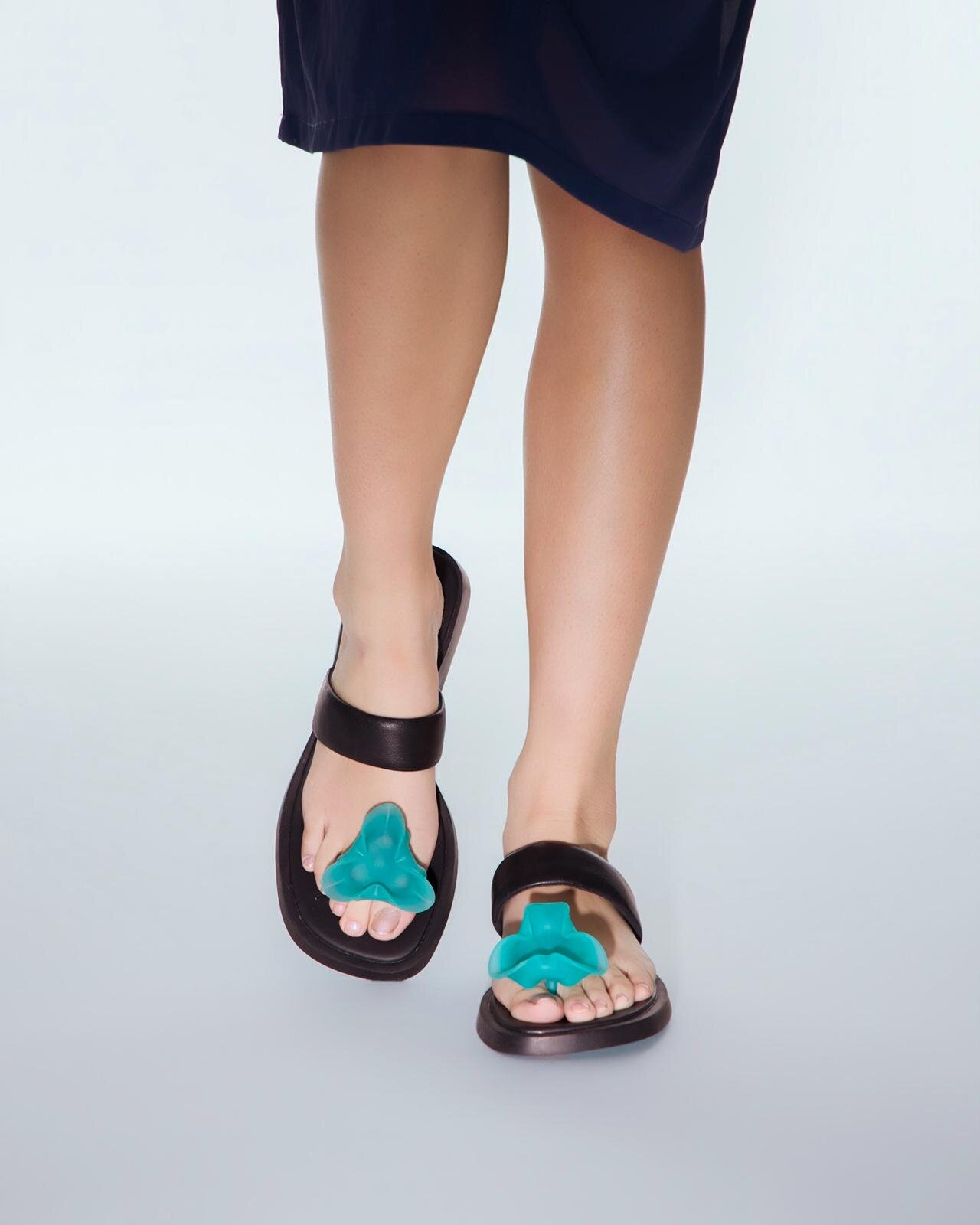 Un bolso con forma de tulipán y sandalias con motivos florales en las tiras. La incorporación de elementos en relieve es una característica única de bolsos y zapatos.