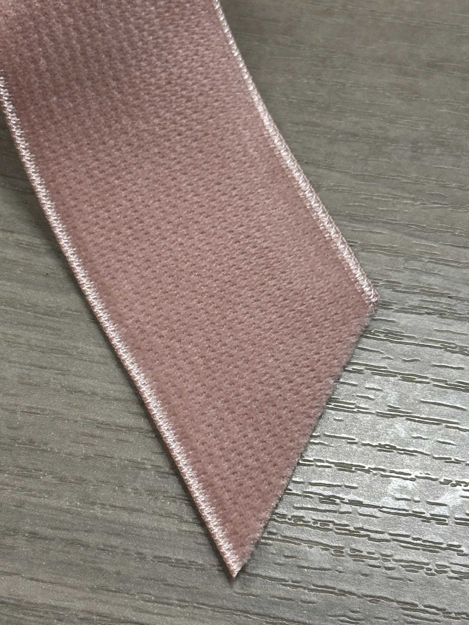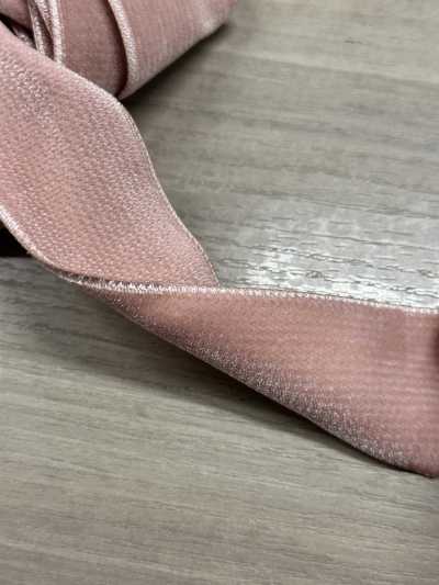Ambos lados están hechos de terciopelo, lo que le da a esta cinta el grosor adecuado y una fuerte presencia. ¡Quedaría genial si se usara para marcar la cintura de un vestido, como tirantes o como cintas decorativas, creando un aspecto clásico! Tiene una textura mate, por lo que, por supuesto, también puedes usarlo para ocasiones informales. Me emociono cuando combino el color rosa de C/#20 con la textura de este terciopelo.