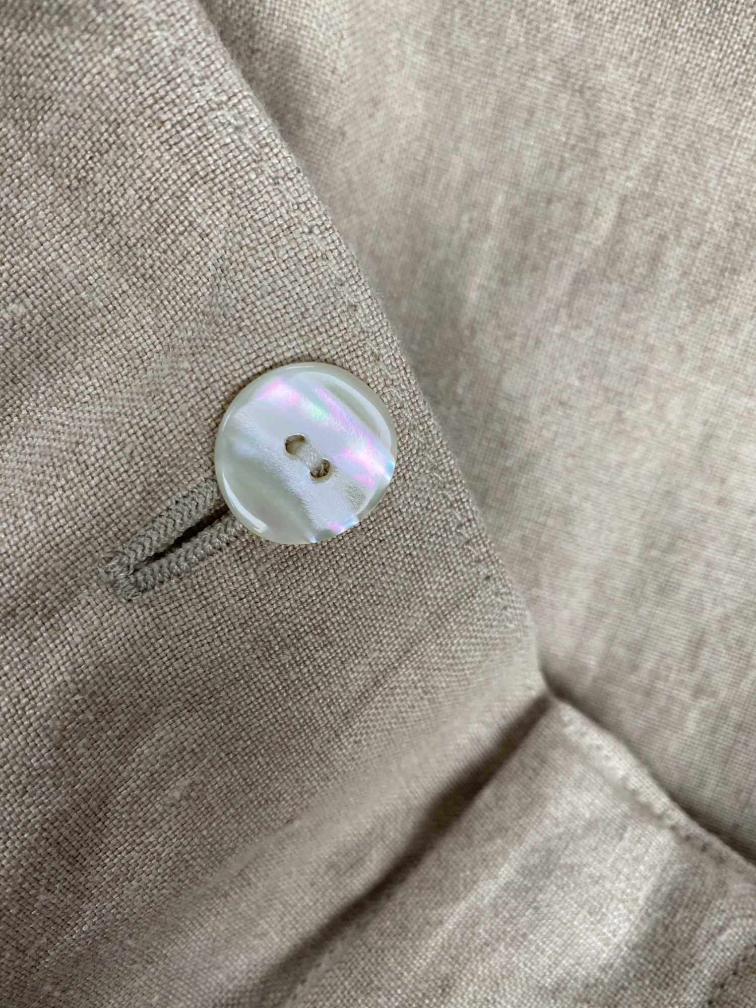 Los botones de concha tienen dos agujeros y no son planos, sino que tienen una forma ligeramente distorsionada. Se caracterizan por el hermoso brillo que sólo tienen las conchas naturales y los patrones únicos en la parte posterior de cada concha.