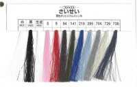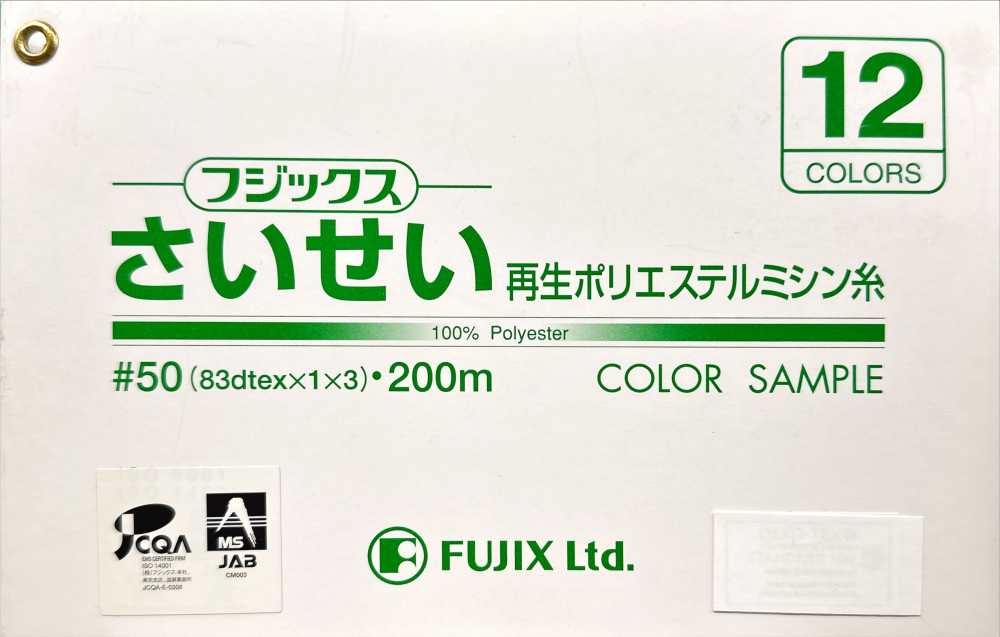 Esta es una tarjeta de muestra del hilo de coser de poliéster reciclado "Saisei" de FUJIX.