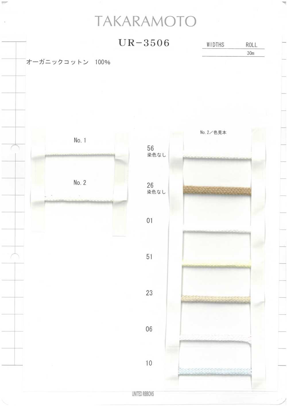 Esta es una tarjeta de muestra de husos de algodón orgánico UNITED RIBBONS UR-3506.